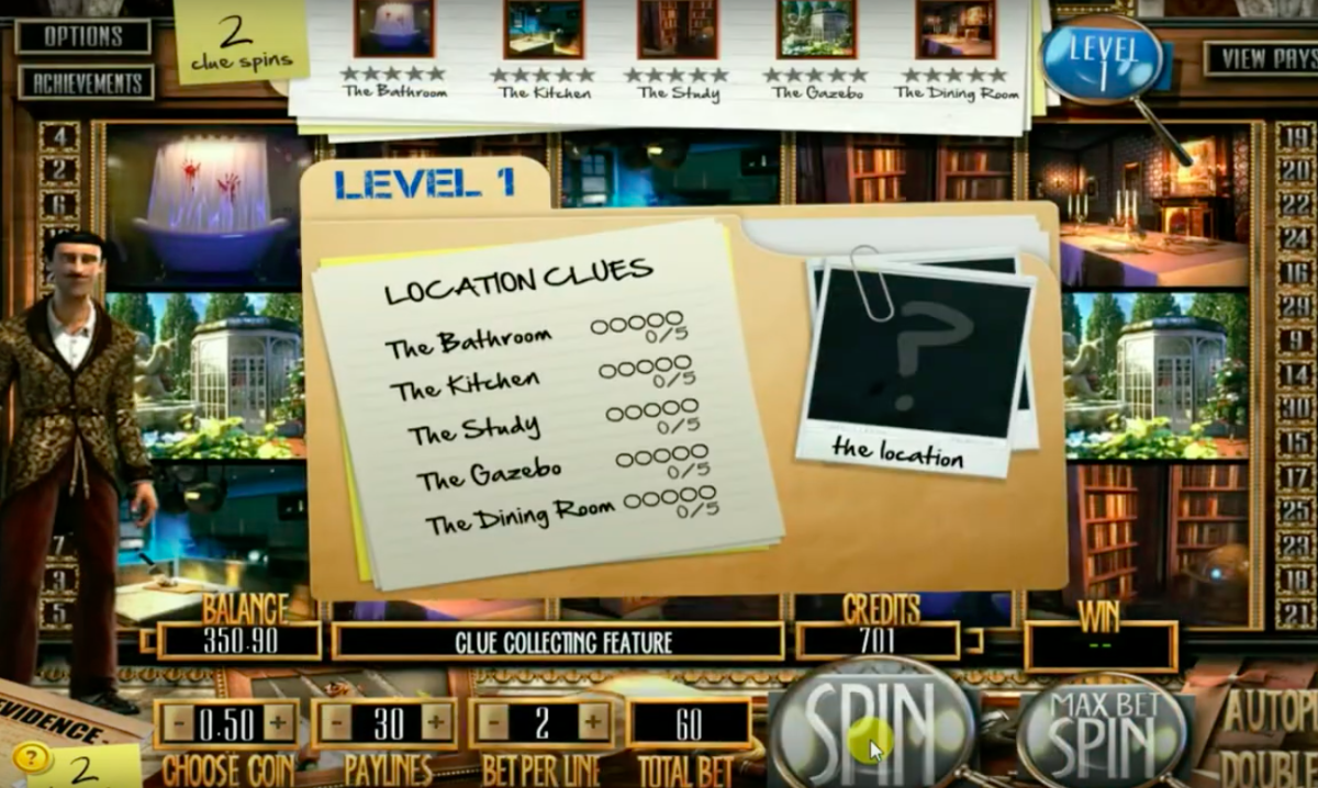The shooting spot bonus game has different symbols on the reels when you get different levels. You will see symbols like the Kitchen, Study, Bathroom, Gazebo, and Dining Room on the first level.