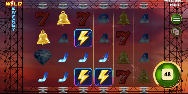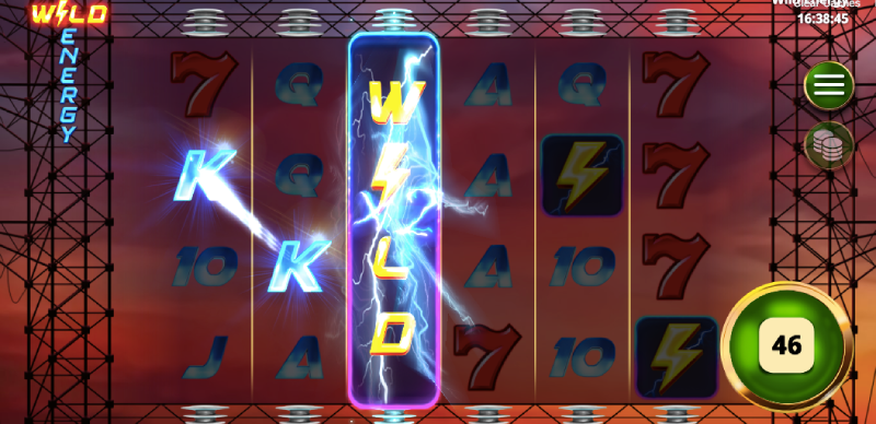 The Wild Energy game features reels that hang from a large gantry between two pylons, creating an impressive sight. The game symbols have clean lines and a modern feel, with a mix of playing cards, classic slot symbols like Liberty Bells and Lucky Red 7s, and a large diamond. The lightning symbols in this game are important since they activate the game’s modifiers. The soundtrack fits the theme well, with a funky and edgy vibe, and occasional sound effects related to electricity.