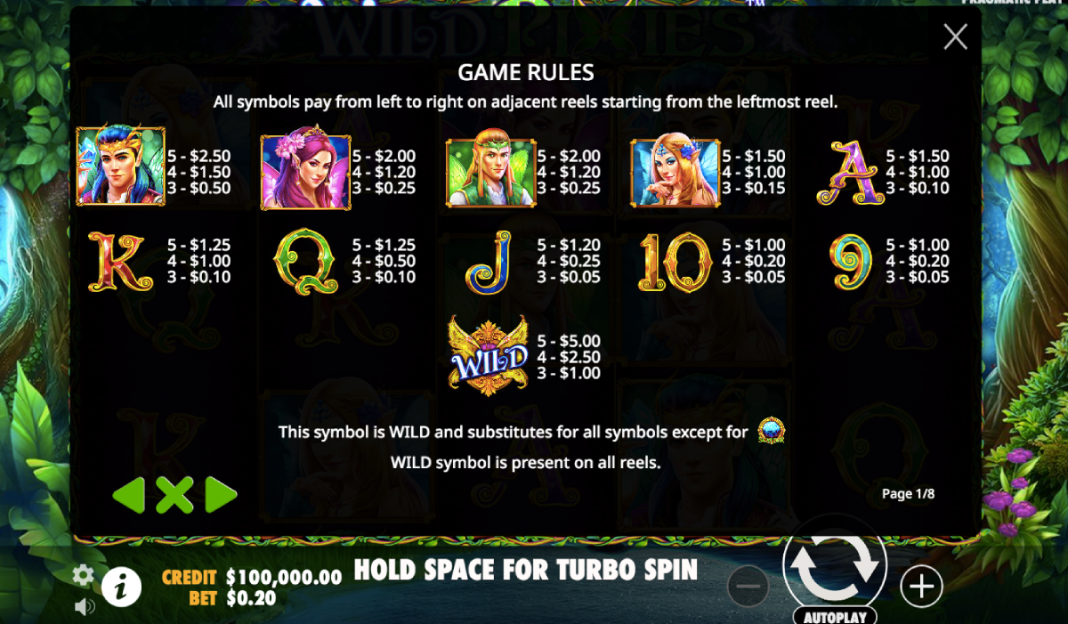 As you start this fantasy, you will notice that magic is all around the pixie and elve characters. With five reels, this twenty pay line video slot has amazing graphics and an excellent storyline. The first thing you should do after you open Wild Pixies is to select the minimum bet and click spin.