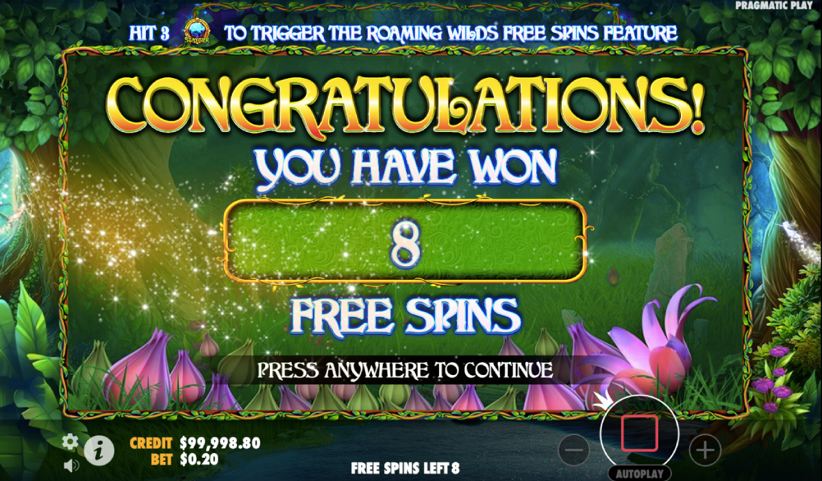 Once you trigger the scatter nudge, you will see the icons on the fifth reel move up and down. As a result, this adds to the scatter symbols position and can trigger even more free spins! During the Roaming Wild bonus round in Wild Pixies slot machine, you will begin with eight free spins. However, you can re-trigger these spins.