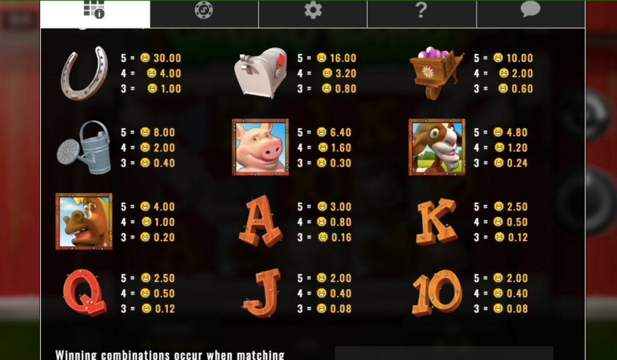 Win 500 coins by scoring five barrels and three hundred twenty coins landing pigs. Five Horse symbols are worth 200, which five water barrels are worth 400 coins. Score 5 goats on the wheels and win 240 coins.
