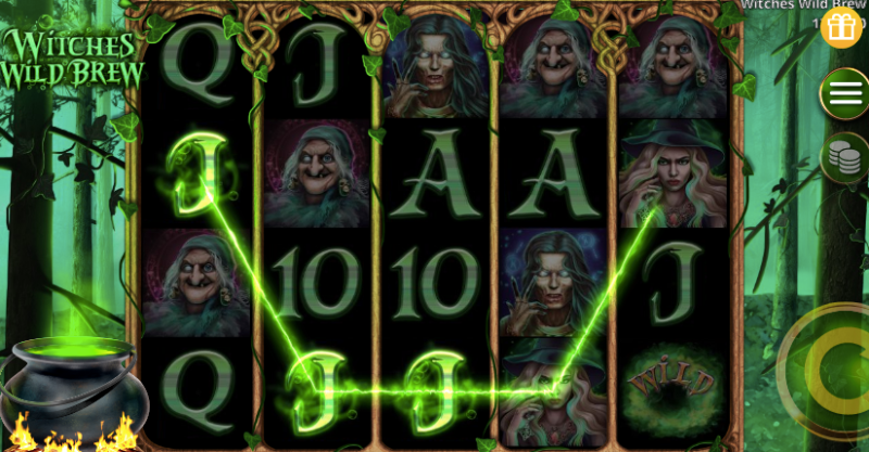 The game “Witches Wild Brew” is a popular Halloween-themed slot game as its backdrop. The game’s reels have a Celtic-style design with ivy vines and leaves, and there is a glowing green cauldron on a fire emitting smoke.The free spins cause the color of the forest to change from sepia to a rusty red, giving the impression that it is on fire.