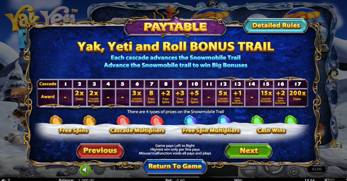 Enjoy Cascading symbols when you play Yak, Yeti and Roll. If you are not sure what cascading means, it just means the game removes the icons from the reels and replaces them. At ps4rm.com, we love progressive jackpot games. However, Yak, Yeti, and Roll offer a big 92,750 coins ($92,750) top non-progressive jackpot payout on one spin. If we have to categorize this theme, it goes in the Christmas/Holiday category.
